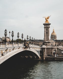 Le pont Alexandre III enjambe la Seine dans le 7ème arrondissement et le 8ème arrondissement de Paris reliant l’esplanade des Invalides d’un côté et l’avenue Winston Churchill de l’autre, où se trouvent le Petit Palais et le Grand Palais. Ce pont de Paris est l’un des plus emblématiques de la capitale du fait de sa position géographique à proximité de monuments incontournables ainsi que pour son allure majestueuse avec ses ornements. Classé Monument historique, il est également labellisé Patrimoine du XXème siècle. Au fil des siècles, le pont Alexandre 3 a vu défiler bon nombre de Parisiens et touristes. Très apprécié pour la vue panoramique qu’il offre sur les plus prestigieux monuments de la Ville Lumière, tels que la tour Eiffel, le pont Alexandre III est un des lieux incontournables à découvrir à Paris.