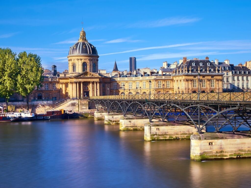 Le pont des Arts à Paris enjambe la Seine sur 155 mètres de long au cœur de la capitale entre les 6ème et 1er arrondissements. Il relie d’un côté l’Institut de France (6ème arrondissement) et de l’autre le palais et musée du Louvre (1er arrondissement). Le pont est classé Monument historique et fut le lieu de rendez-vous des amoureux du monde entier venus pour y accrocher un cadenas d’amour. Parmi les plus emblématiques ponts de Paris, le pont des Arts se démarque dans le paysage urbain avec ses arches en acier. Il a inspiré et continue d’inspirer les artistes de partout dans le monde. Le pont des Arts, aussi appelé le pont des amoureux, constitue l’une des visites incontournables à réaliser à Paris et participe à la grande richesse du patrimoine parisien.